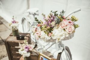- 17. Hranatá brána dřevěná z hranolů s bílými květinami